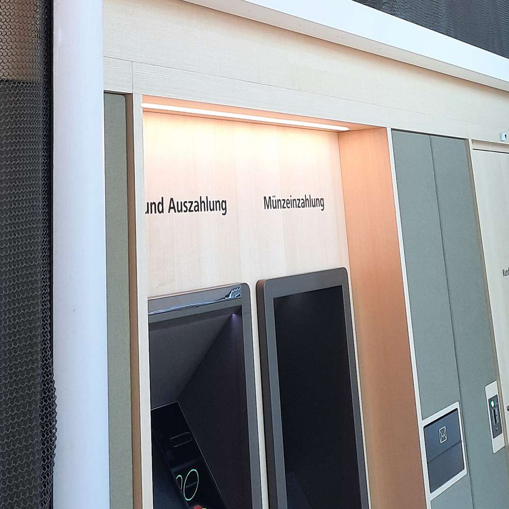 - Besonderheit: Das untere U-Profil ist 2.450 mm über dem fertigen Fußboden montiert und ermöglicht damit uneingeschränkten Zugang zu den darunterliegenden Geldautomaten.